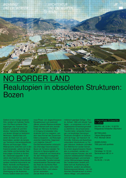 Südtirol ist kein Gefüge einzelner Orte, sondern ein hybrides Territorium. Ein Raum extremer Überlagerungen aus Tourismus und Industrie, Landschaft und Infrastruktur, historischer Aufladung und akutem Mangel an leistbarem Wohnraum. Südtirol lässt sich weder als Stadt noch als Land beschreiben, sondern als komplexes Territorium ineinandergreifender Räume und Nutzungen. Diese Widersprüche verdichten sich in den Kasernenarealen, welche bis heute viele Städte und Gemeinden Südtirols prägen. Errichtet im Kontext der „Italianisierungspolitik“ in den Jahren des Faschismus, waren sie nicht nur militärische Infrastrukturen, sondern räumliche Instrumente von Macht, Kontrolle und Repräsentation.Heute verlieren diese Anlagen ihre militärische Funktion. Mit ihrer Übertragung an die Autonome Provinz Südtirol treten sie in eine neue Phase: vom abgeschlossenen Disziplinarraum zum potenziell offenen urbanen Ressourcenkörper. Dieser Moment wirft eine zentrale Frage auf: Wie kann Architektur im Umgang mit obsoleten Infrastrukturen nicht nur reagieren, sondern neue Formen des Zusammenlebens antizipieren - als Realutopie zwischen Geschichte, Gegenwart und möglicher Zukunft?