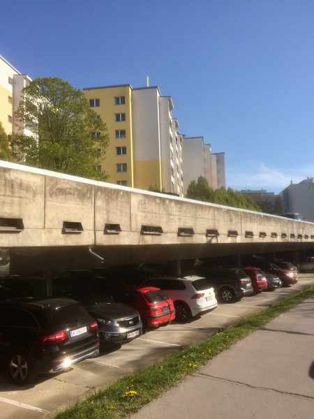 Die 1971-72 aus Fertigteilen errichtete und vor kurzem thermisch und baulich sanierte, stark gegliederte Wohnhausanlage der Gemeinde Wien in Simmering, Muhrhoferweg, bildet hufeisenförmige, gegen die Hauptwindrichtung geschützte, von der stark befahrenen Straße abgewandte Hofräume. Die PKW-Stellplätze sind in zweigeschossigen Parkpaletten entlang der Etrichstraße untergebracht.