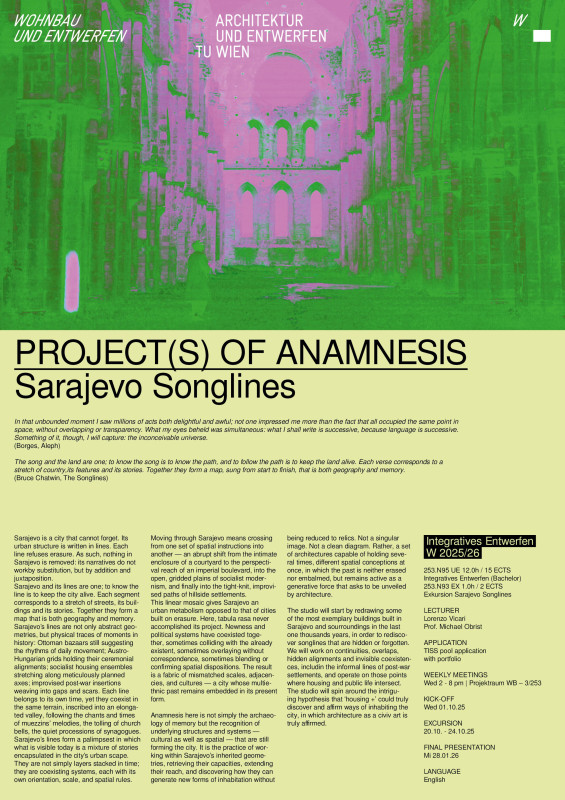 The studio will start by redrawing some of the most exemplary buildings built in Sarajevo and sourroundings in the last one thousands years, in order to rediscover songlines that are hidden or forgotten. We will work on continuities, overlaps, hidden alignments and invisible coexistences, includin the informal lines of post-war settlements, and operate on those points where housing and public life intersect. The studio will spin around the intriguing hypothesis that ‘housing +’ could truly discover and affirm ways of inhabiting the city, in which architecture as a civiv art is truly affirmed.