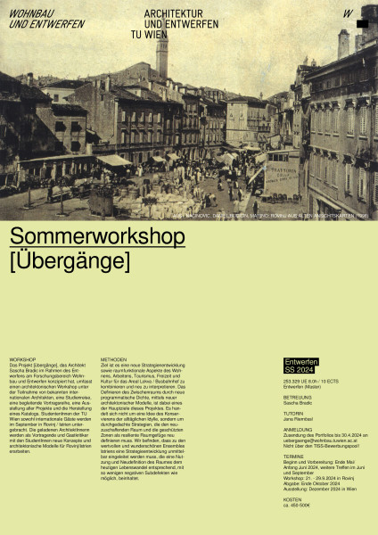 Das Projekt [übergänge], das Architekt Sascha Bradic im Rahmen des Entwerfens am Forschungsbereich Wohnbau und Entwerfen konzipiert hat, umfasst einen architektonischen Workshop unter der Teilnahme von bekannten internationalen Architekten, eine Studienreise, eine begleitende Vortragsreihe, eine Ausstellung aller Projekte und die Herstellung eines Katalogs. StudentenInnen der TU Wien sowohl internationale Gäste werden im September in Rovinj / Istrien untergebracht. Die geladenen ArchitektInnenn werden als Vortragende und Gastkritiker mit den StudentInnen neue Konzepte und architektonische Modelle für Rovinj/Istrien erarbeiten.